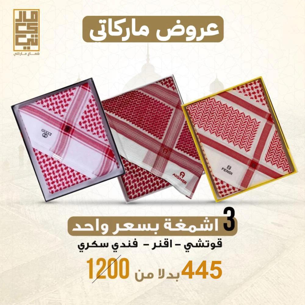 احصل الآن على عرض مميز يشمل ثلاث اشمغه بسعر شماغ واحد شماغ قوتشي الأنيق و فندي الناعم واقنر المميز بتصميمات تجمع بين الأصالة والحداثة لتكمل أناقتك بكل تفاصيلها.