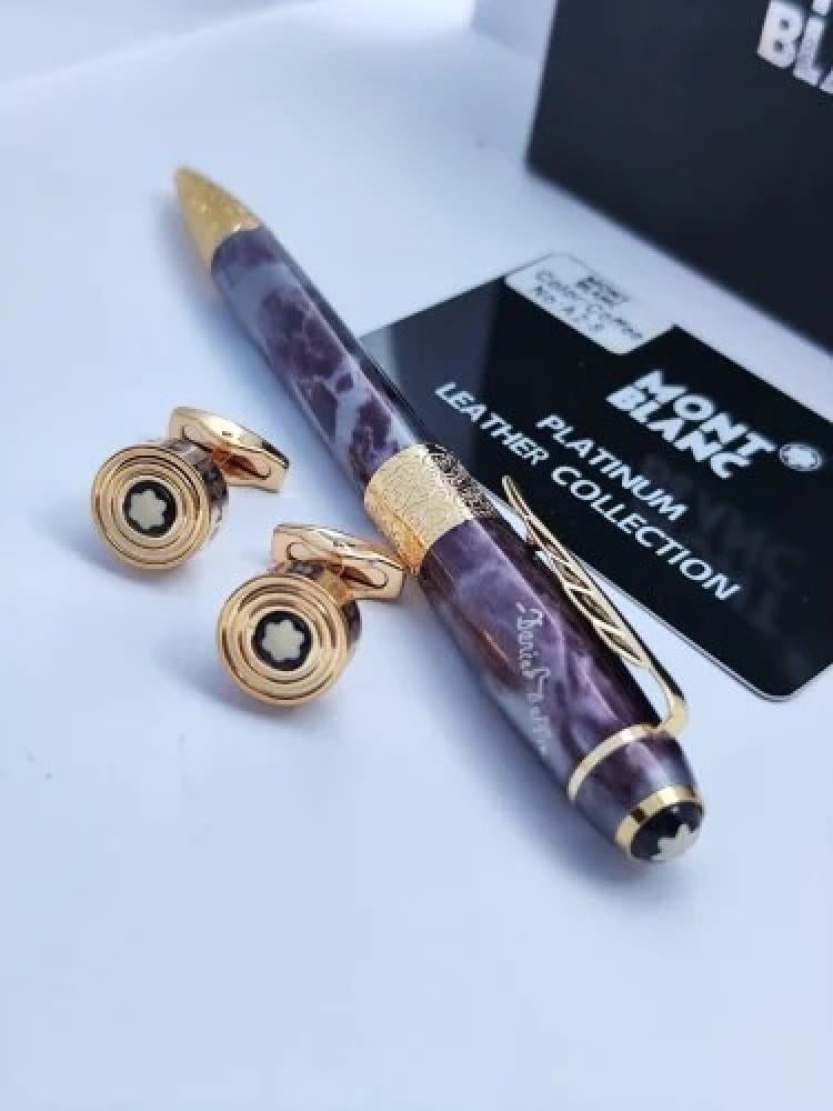 تجسيد للأناقة المطلقة والفخامة النادرة، يتكوّن الطقم من قلم بتصميم رخامي فاخر باللون البنفسجي مع لمسات ذهبية، وكبك أنيق بتفاصيل هندسية مميزة. طقم يناسب أصحاب الذوق الرفيع والباحثين عن التميز في كل تفصيلة.