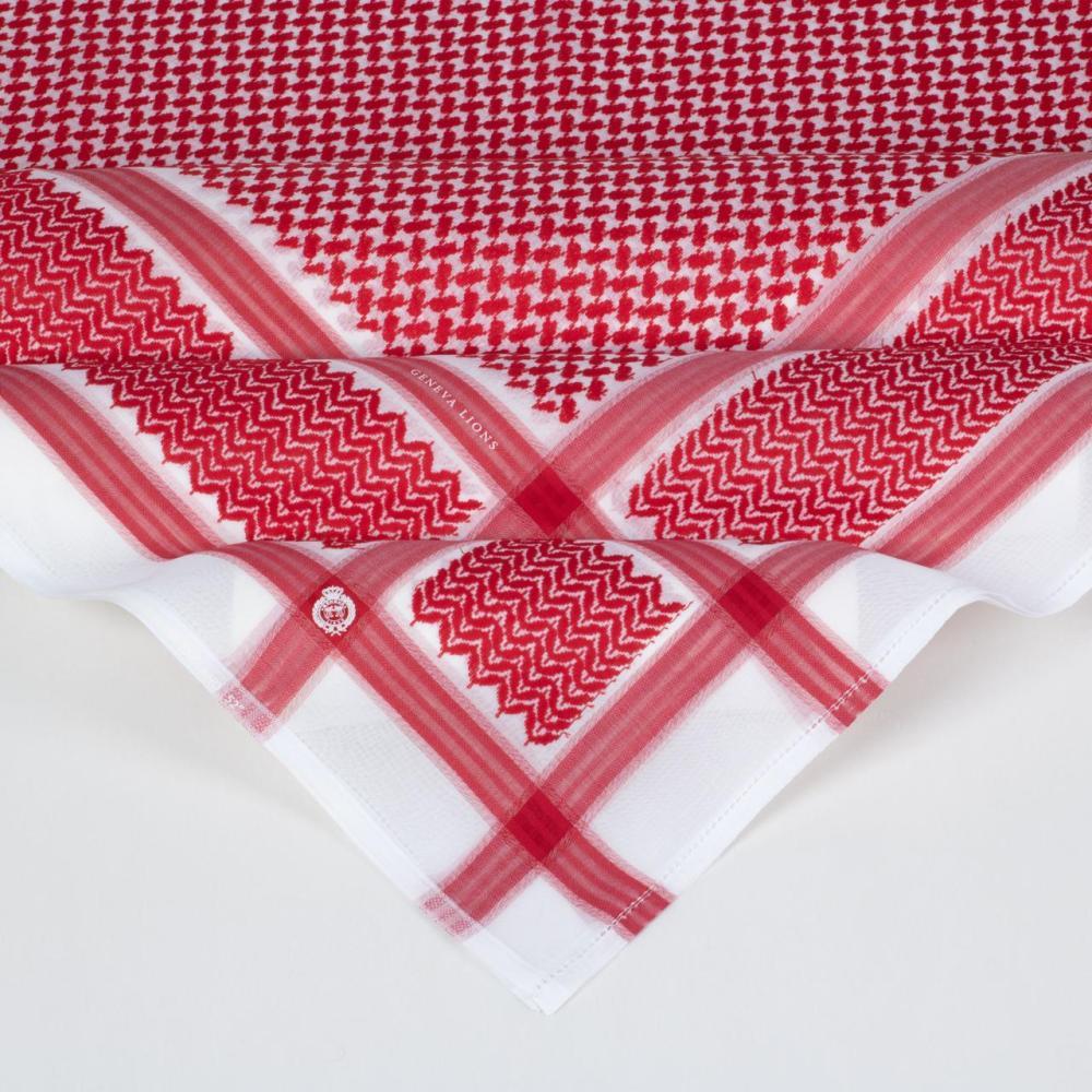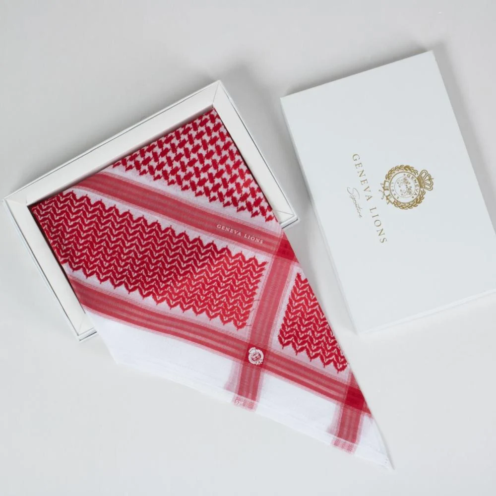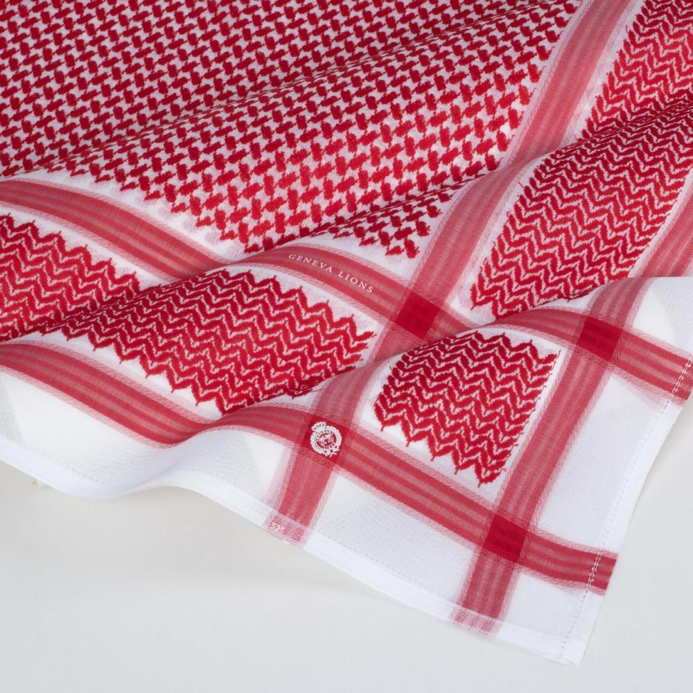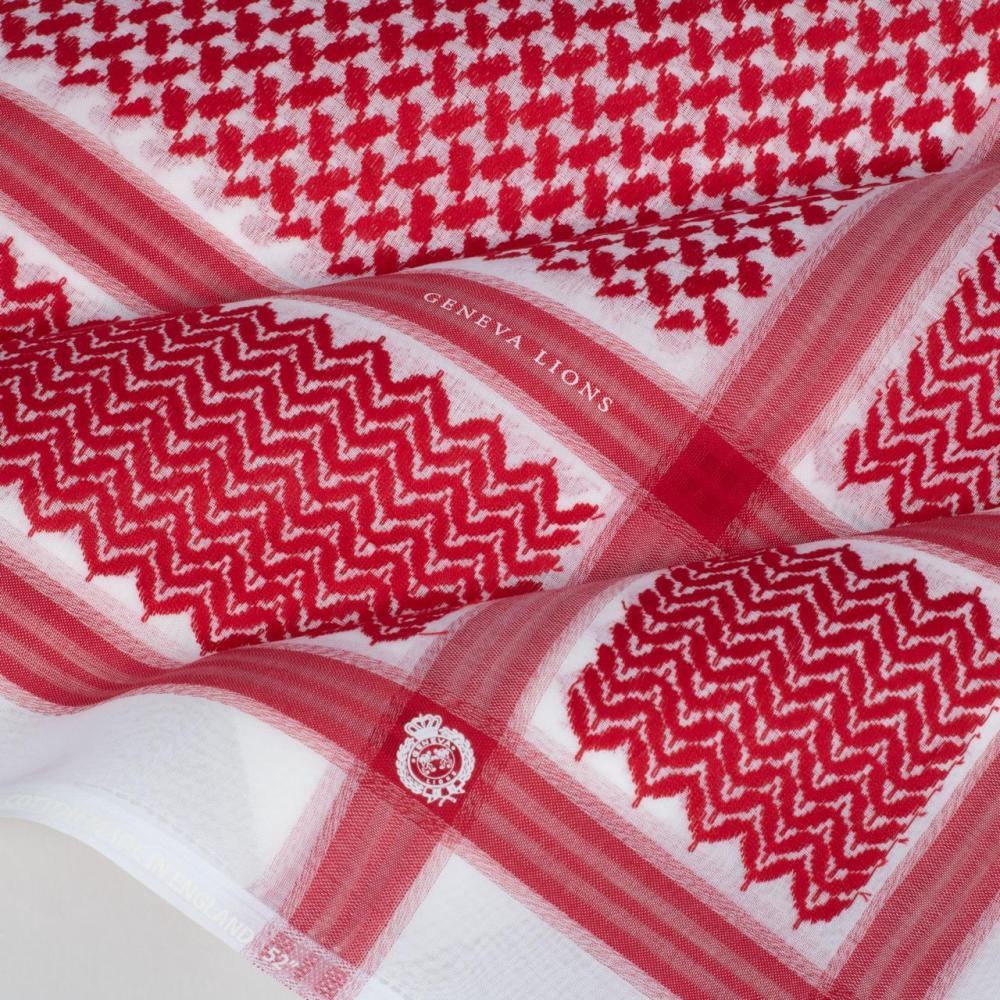 - الختم: ختم جينيفا الأبيض المطرز بدقة عالية، يبرز فخامة الشماغ ويمنحه لمسة ملكية راقية والختم الأبيض يضفي تباينًا ناعمًا وأنيقًا مع اللون الأحمر للنقش.
